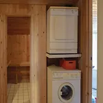 La Four-Bedroom Holiday Home In Tranekar dispone de un cuarto de baño con una bañera de hidromasaje y una ducha. Para mayor comodidad, ofrece una secadora.